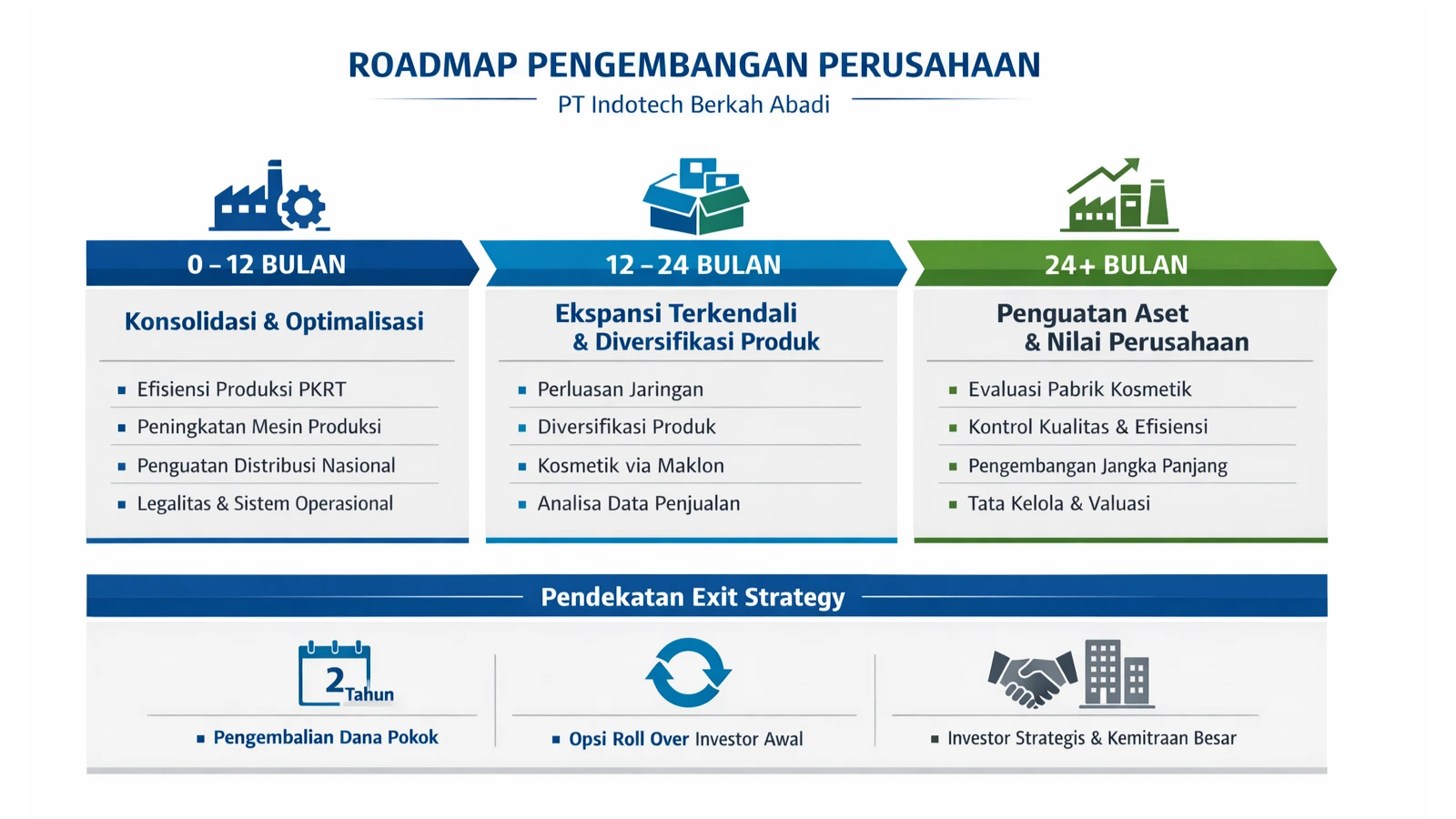 *: Target jangka menengah adalah memperkuat kapasitas produksi, memperluas distribusi nasional, serta mengembangkan lini produk bernilai tambah secara bertahap dan terukur.